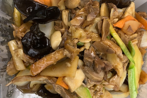 /патешки бут, бамбук, черни гъби, тиквички, лук, моркови, печурки, соев сос, чесън/
