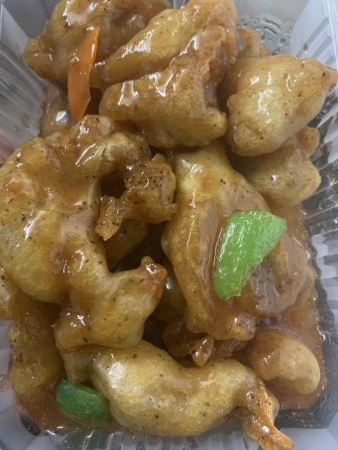 /панирано филе от хек със сладко кисел сос, чушки, моркови/