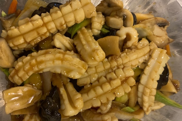 /Калмари, бамбук, черни гъби, тиквички, лук, моркови, печурки, соев сос, чесън, джинджифил/