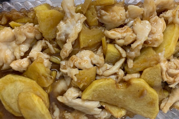 /пилешко филе, пресни картофи, соев сос, чесън/